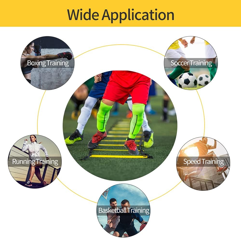 【Ideal Exercise Tool】- This agility ladder set includes everything you need to whip yourself into shape. It includes 1pcs 20ft 12 rungs agility ladder, 4pcs steel stakes for added stability, and 1pcs carry bag.