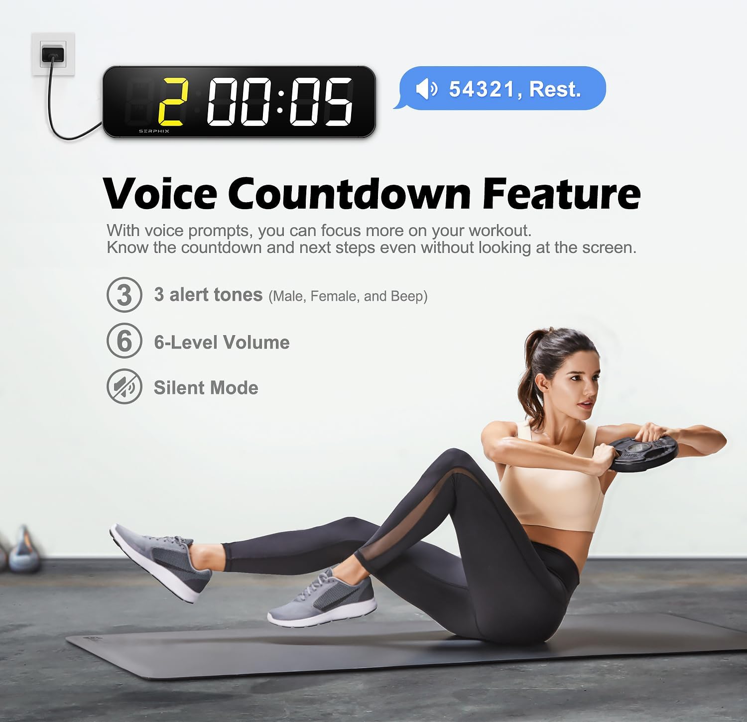 【Voice Countdown Alerts】– The timer features a built-in speaker for voice countdown alerts (with male and female voice options). The voice alert function allows you to know the countdown time and the next step without having to look at the screen, enabling you to focus more on your workout.