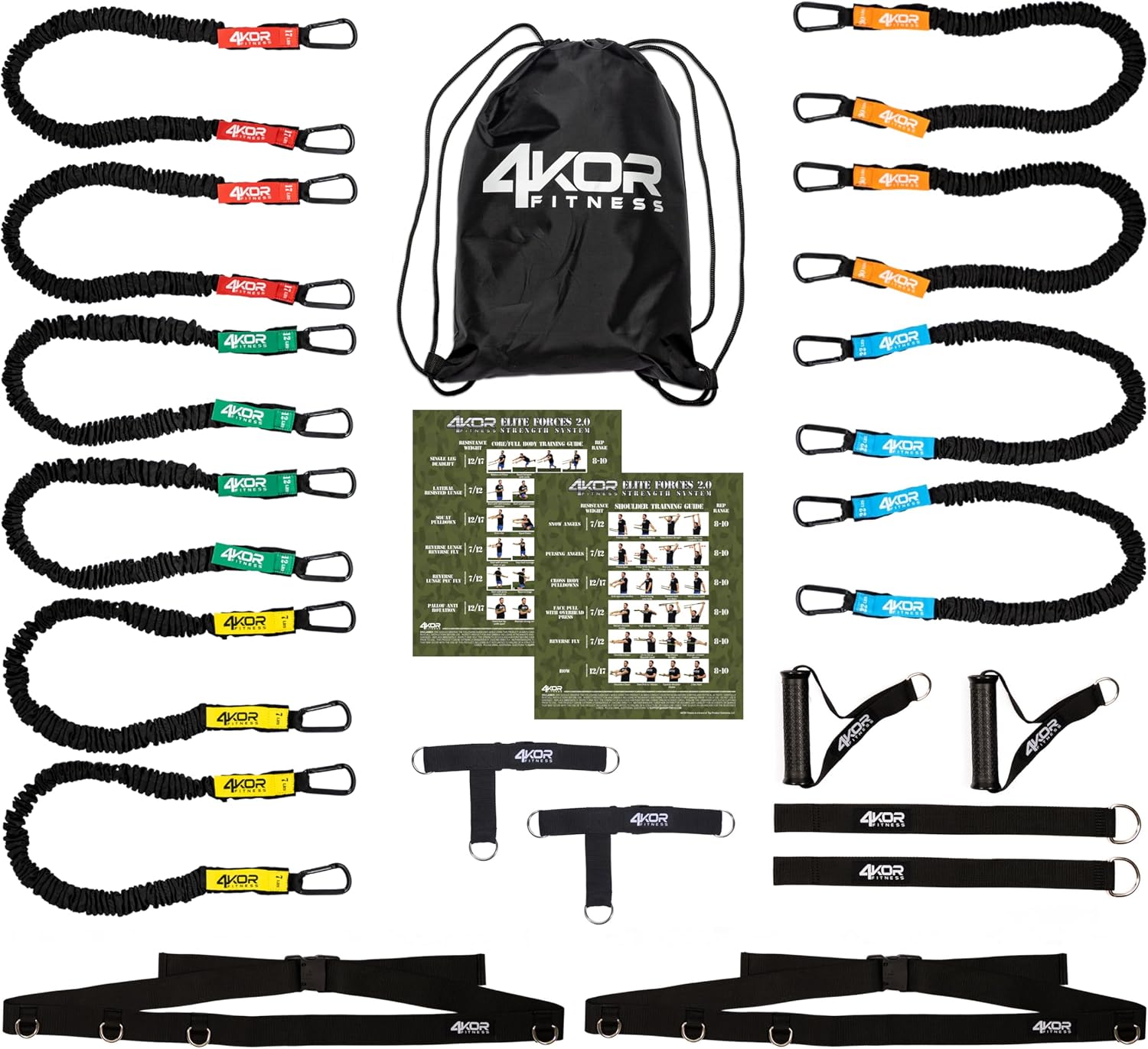 Build Shoulder and Core Strength and Stability – The Deluxe 4KOR Resistance Cord Strength System is designed to be a convenient system to improve shoulder and core strength and stability. This system includes 5 different resistance levels (7lbs, 12lbs,17lbs, 22lbs, and 30lbs), with 2 cords per resistance level, for a total of 10 resistance cords. System also includes 2 handles, 2 foot straps, 2 door strap anchors, 2 power rack straps, 2 exercise charts, and a carrying bag.