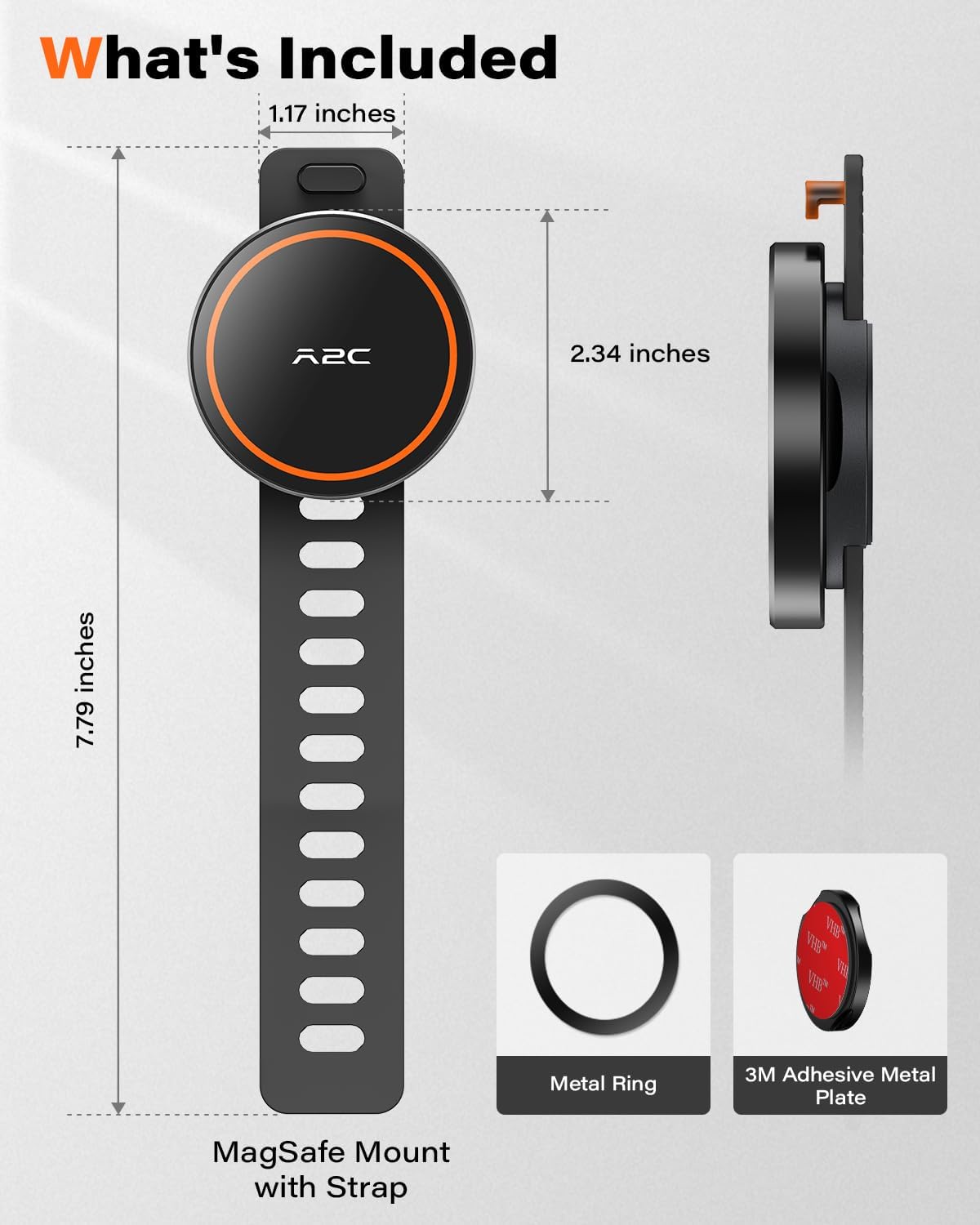 What You Get: The A2C Mag Safe Phone Mount with strap, replaceable adhesive metal base, metal ring for non-Mag Safe phones, user manual, and personalized one-to-one customer service.