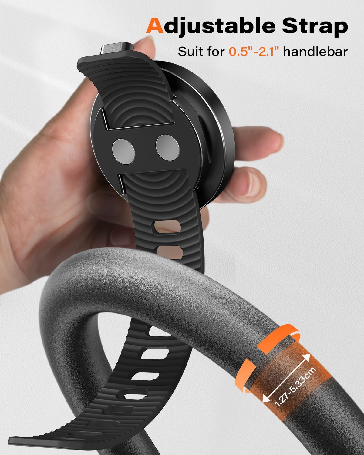 Strap Mode: Securely fasten to equipment handlebars (0.5-2.2″). Magnetic Mode: The strap’s built-in magnets attach directly to any iron surface. Fixed Dock Mode: Pull the magnetic head off the strap and click it onto the included 3M VHB adhesive base for a permanent, reliable hold on walls, car dashboards, and other smooth surfaces.