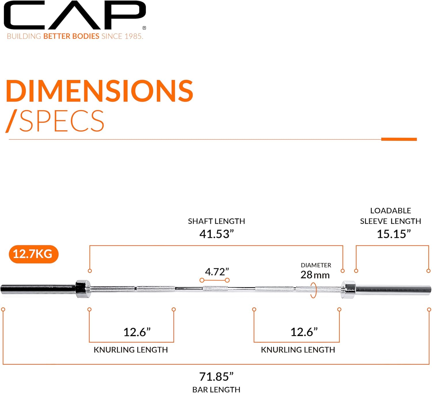 The CAP 5-Foot Solid Olympic Bar in Black is constructed from high-quality solid cold rolled steel with a black powder coat finish and is designed for balance and long-lasting performance. This bar features medium-depth diamond knurled handgrips giving the user a secure, non-slip grip when going heavy. The length between the sleeves measures 37” and has a 28mm handgrip diameter. Each sleeve has a loadable length of 9.75” to accommodate Olympic weight plates with a 2-inch center hole. The sleeves with bushings are designed to rotate, reducing pressure on the forearms and wrists. Made to be compact in length, this bar is a perfect addition to your home gym. Bar is made with 63,800 PSI tensile strength steel with 13 inch knurled griping areas per side. The compact design of this bar makes it perfect for a home gym. Note: The compact design of this bar makes it compatible with certain weight benches; please measure). Collars are not included. 30-day manufacturer’s warranty included. Please read CAP Barbell’s policy prior to purchase to understand what the warranty covers and what it does not.