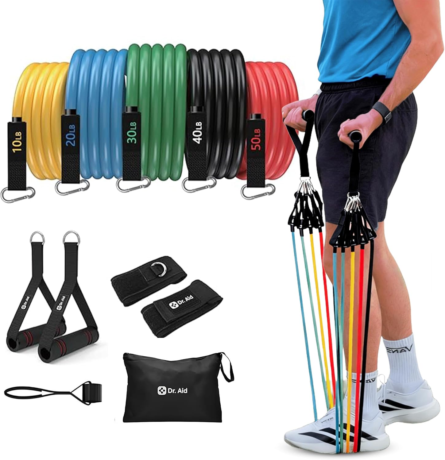 Bandas elásticas para ejercicio en cualquier nivel: El set Dr. Aid incluye 5 bandas elásticas para ejercicio con diferentes niveles de resistencia, perfectas para hombres y mujeres. Cada banda elástica para ejercicio se puede usar para entrenamiento de fuerza, rehabilitación, estiramiento, pilates y rutinas en casa. Con asas, correas para tobillo, anclaje para puerta y bolsa de transporte, este set es ideal para entrenar todo el cuerpo en cualquier lugar.