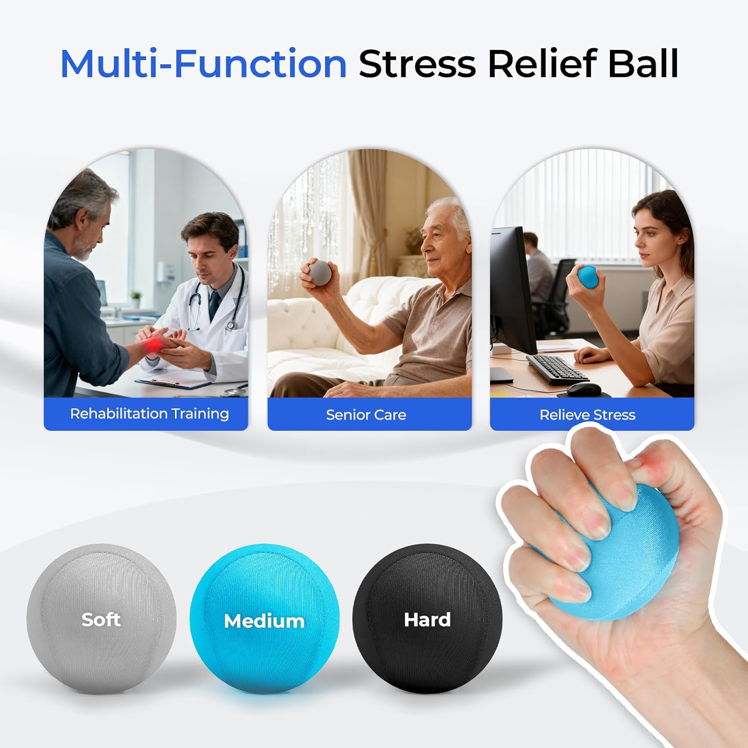 【Premium Stress Relief Balls】: Three stress balls (soft/medium/hard) accompany daily life, effectively relieving stress during work, study, or hand rehabilitation. Covered in soft Lycra fabric with a non-toxic TPR core, their ergonomic shape naturally fits the palm for exceptional comfort.