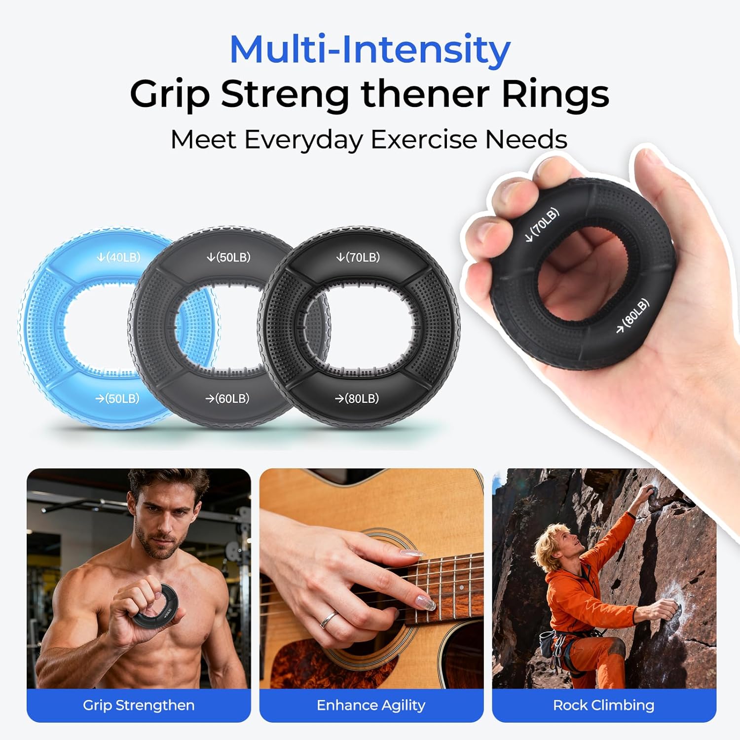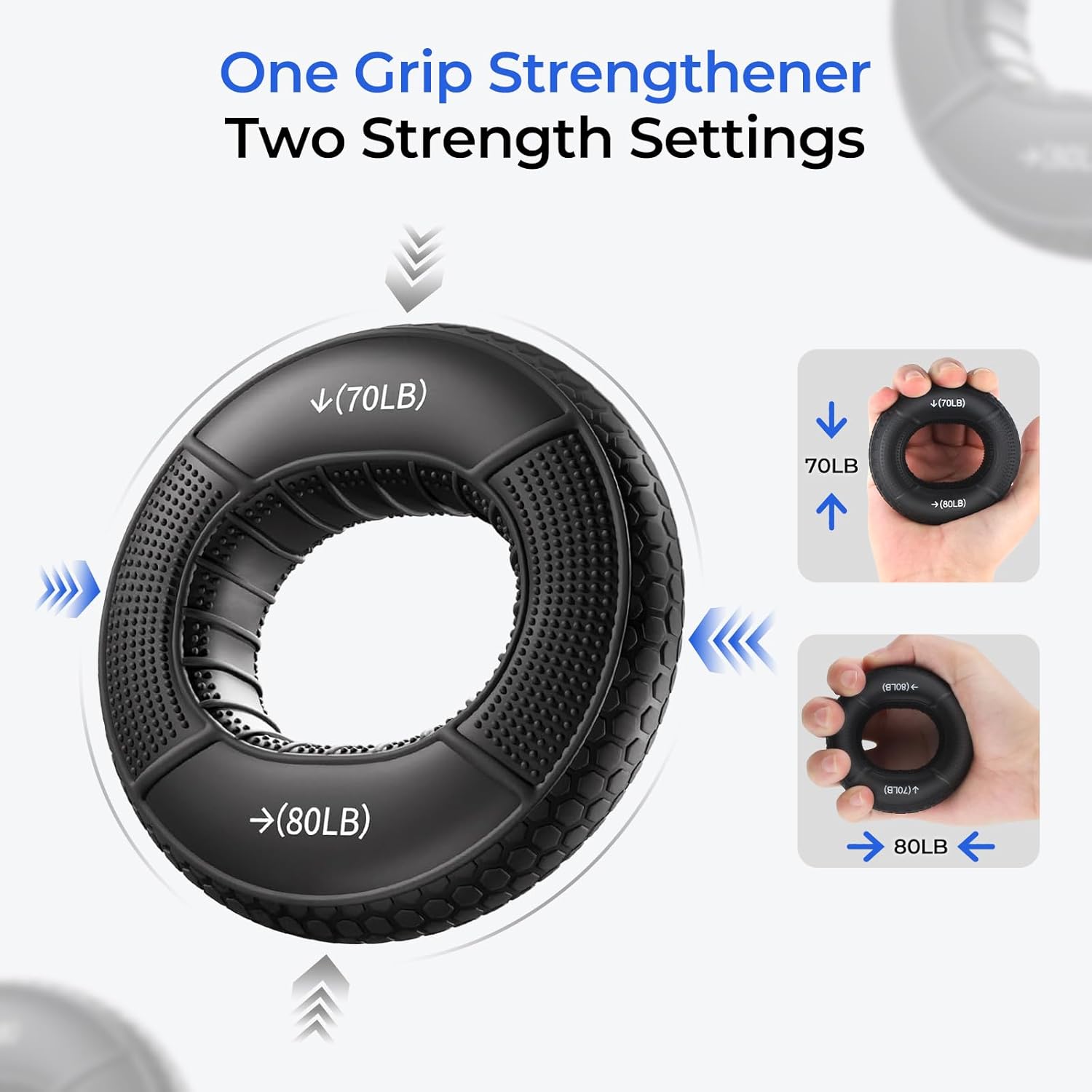 【Dual-Resistance Grip Rings】: Three grip rings with varying resistance levels (40-50LB, 50-60LB, 70-80LB) feature a non-slip textured surface for a secure grip even with sweaty hands. Ideal for progressive training.