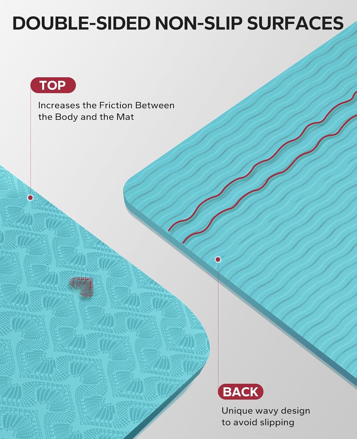 𝐃𝐨𝐮𝐛𝐥𝐞-𝐒𝐢𝐝𝐞𝐝 𝐍𝐨𝐧-𝐒𝐥𝐢𝐩 𝐃𝐞𝐬𝐢𝐠𝐧: Our extra wide yoga mat features a double-sided non-slip surface to keep you stable and secure during your practice without worrying about slipping or sliding. The unique wave pattern on the bottom enhances grip on a variety of surfaces, ensuring your mat stays securely in place even during the most challenging yoga poses. Note:Not for use on carpet