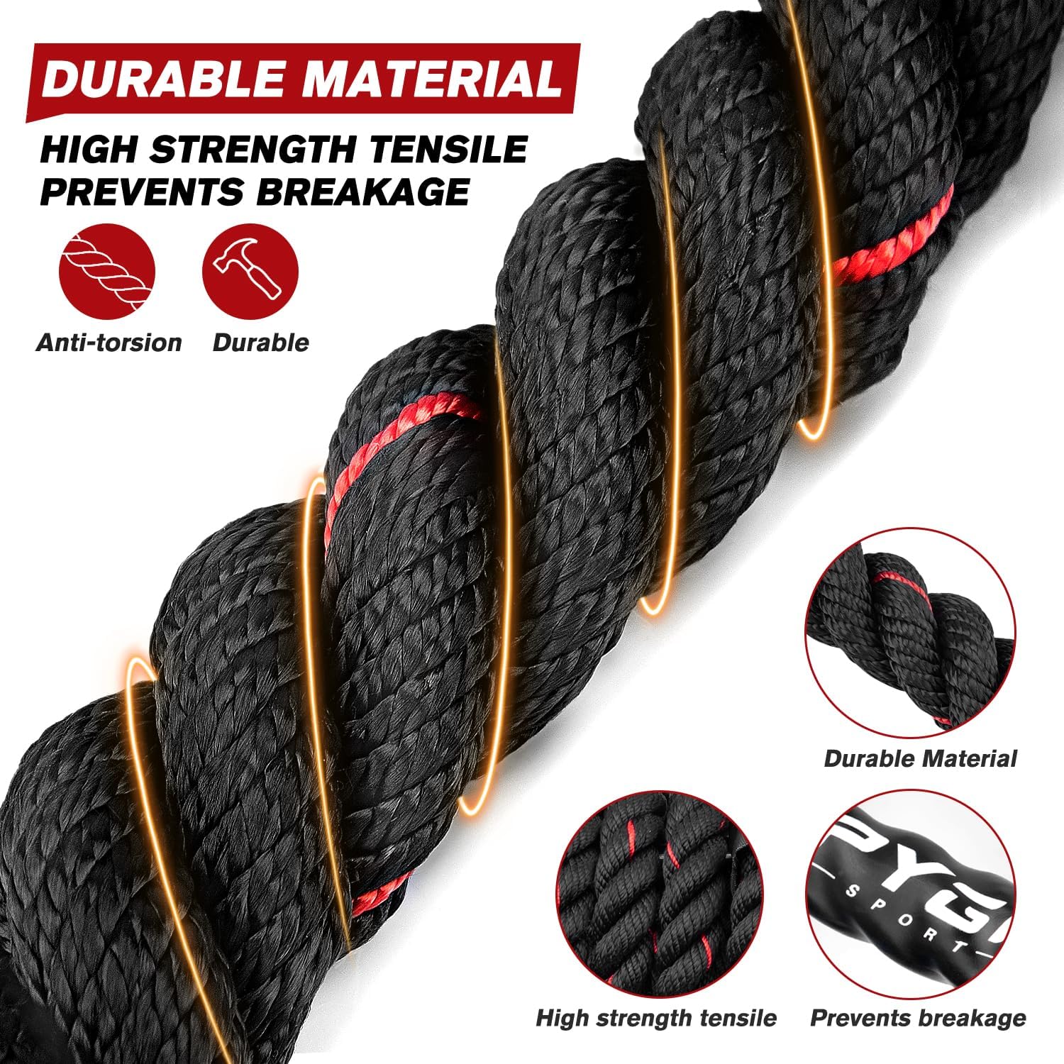 【Durable material】After a long period of experiments, HPYGN heavy jump rope decided to use polymer synthetic fiber as the main material, the high-density polymer synthetic fiber material reaches our ideal weight, has strong wear resistance, prolongs the service life of the jump rope, In line with our purpose of making the weighted jump rope !