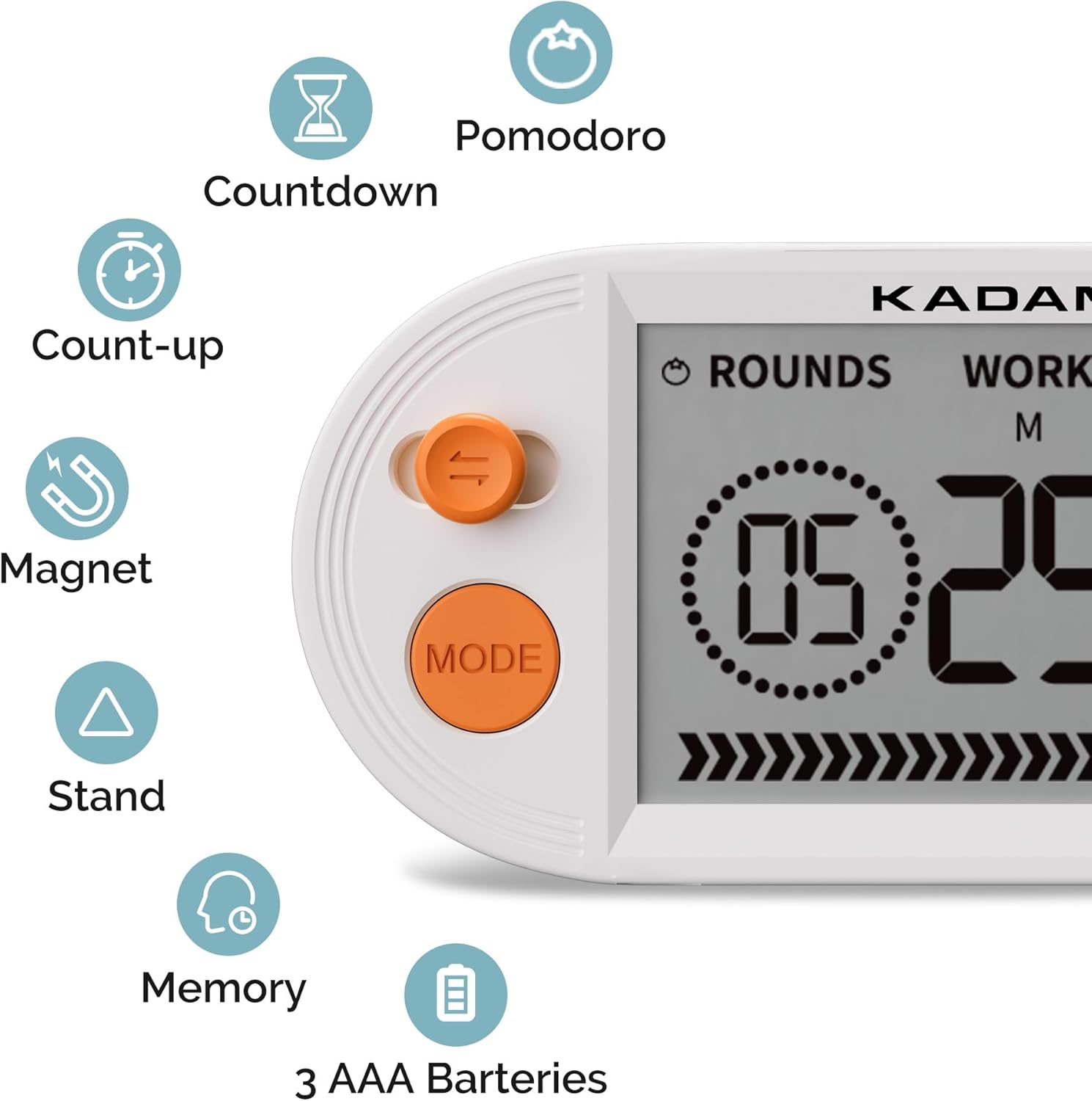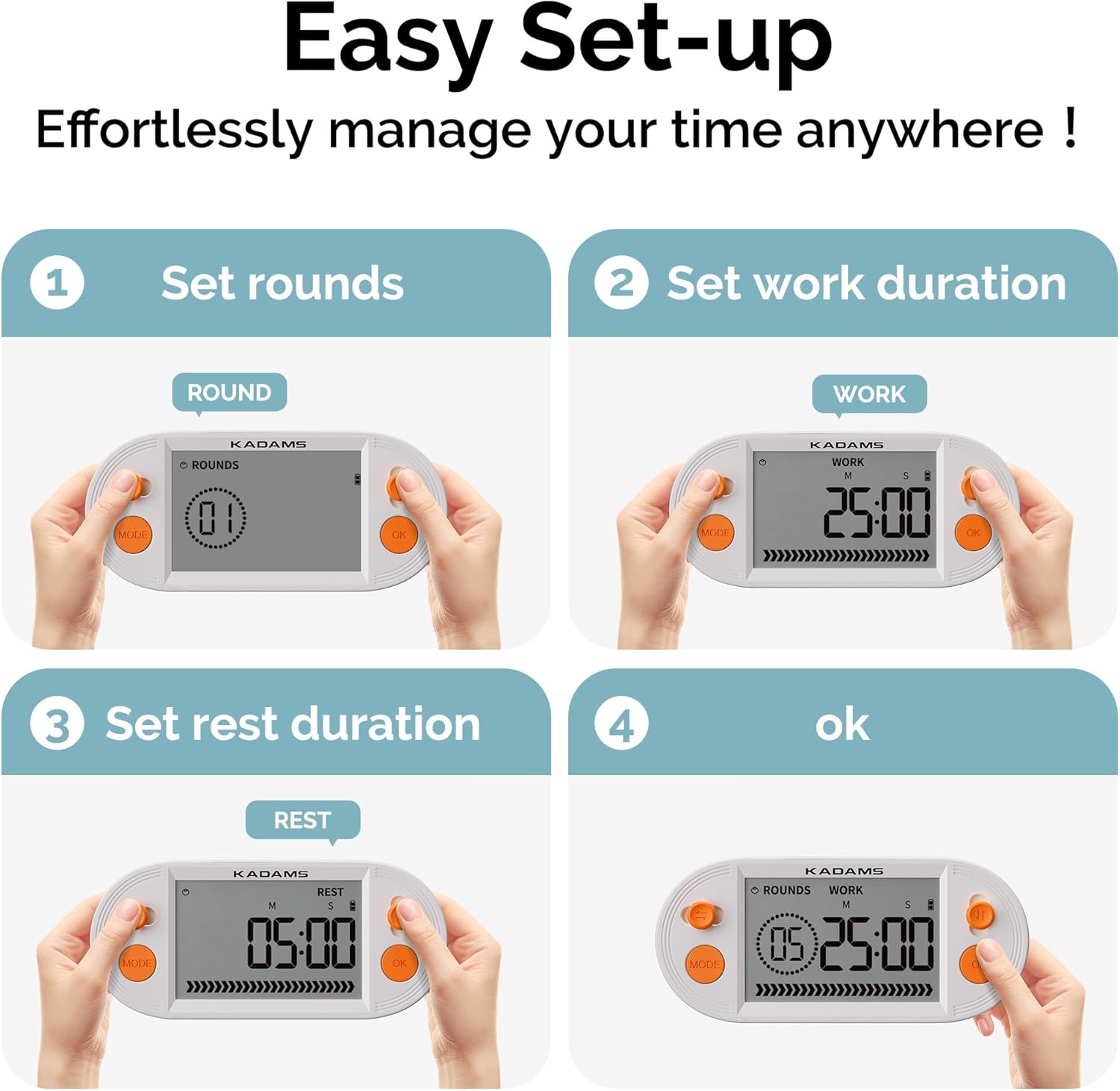 【3 Modes】 Seamlessly switch between pomodoro, countdown, and count-up modes with KADAMS versatile interval timer. Perfect for managing study sessions or energising workouts, this timer helps you maintain productivity and stay active throughout the day
