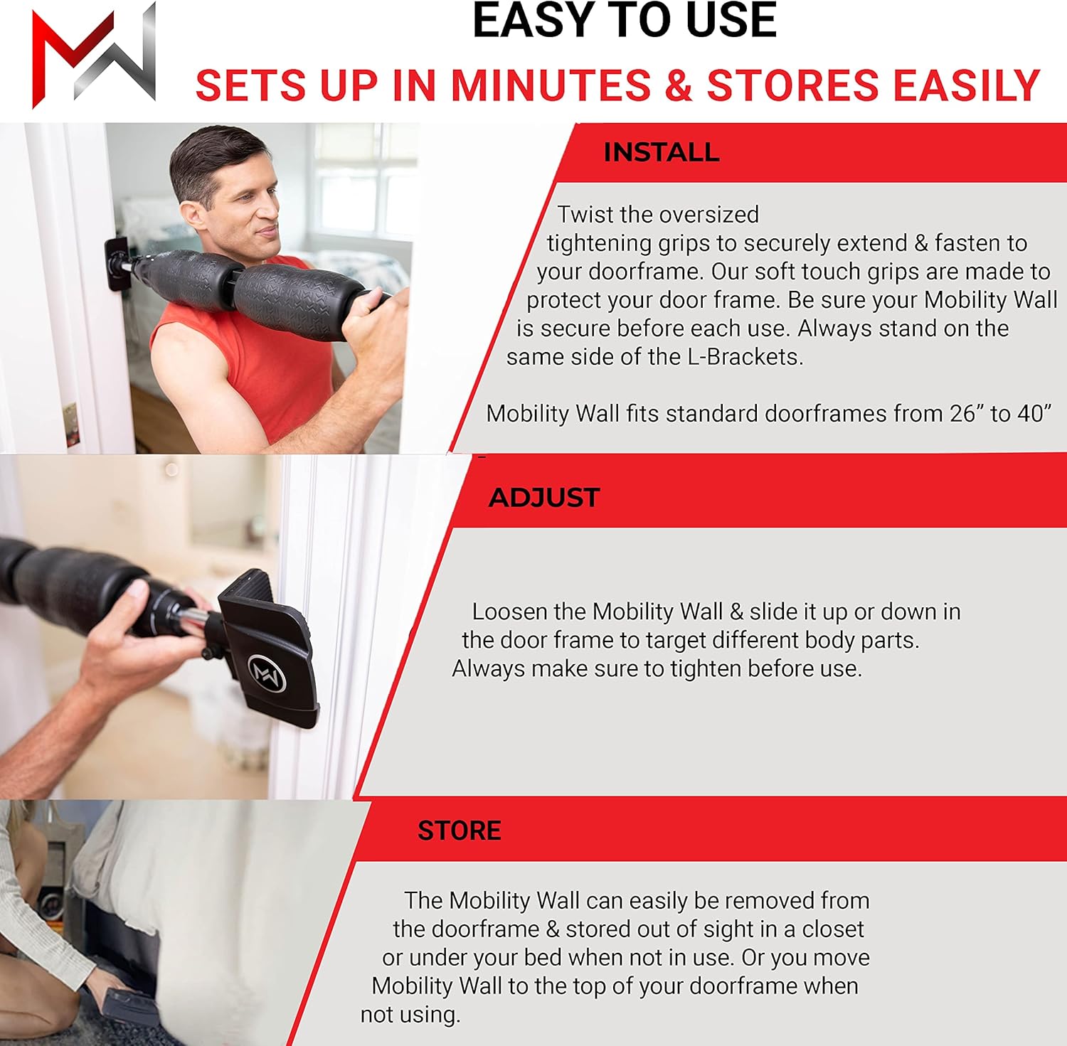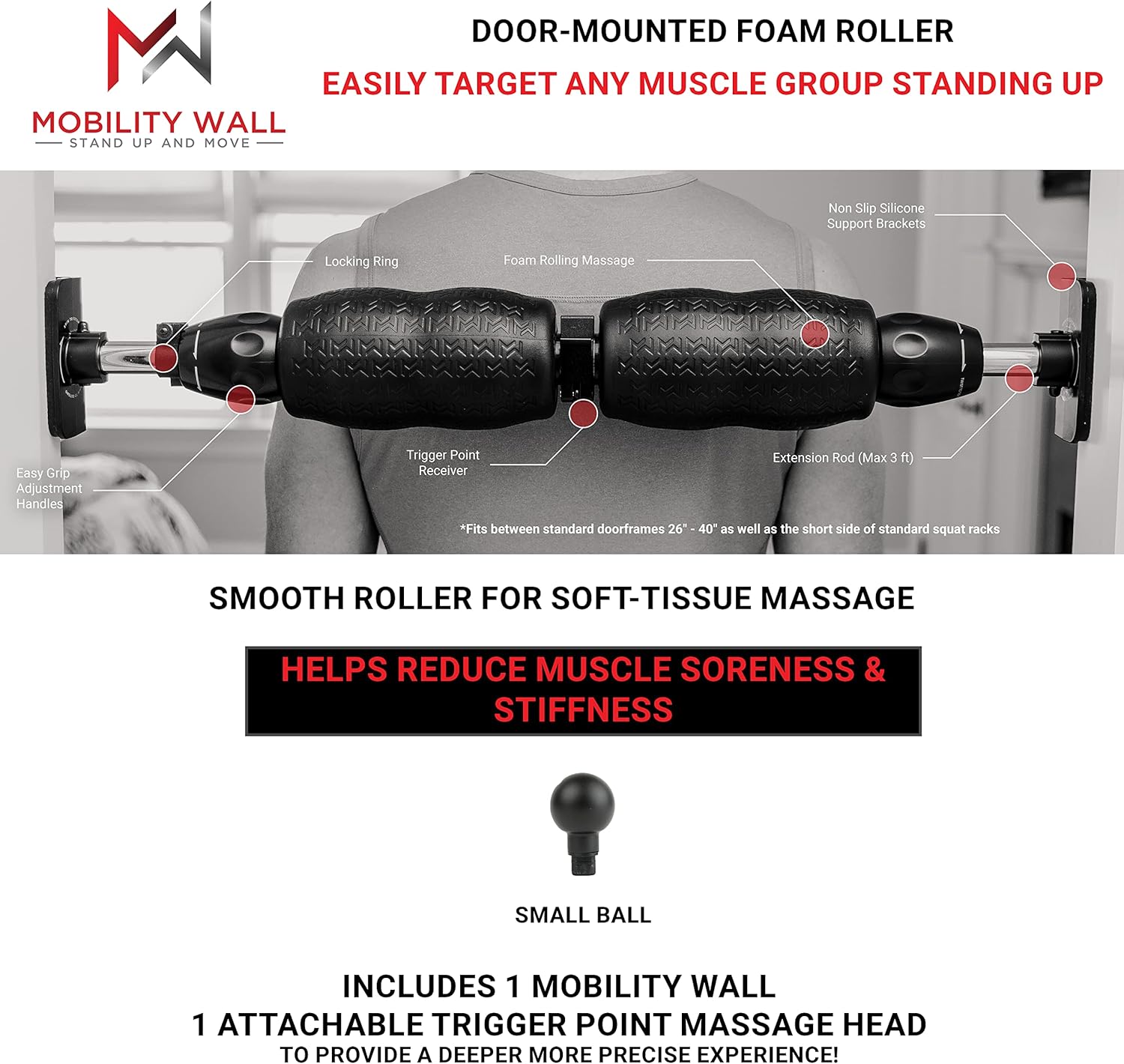 SIMPLE SET UP Mobility Wall ships assembled & sets up quickly. Unlike traditional foam rollers Mobility wall is a stand-up foam roller that fits between doorframes. It fits most standard doors 26in – 40in. To set up spin the L-brackets until they extend to the width of the doorframe. Twist the tightening grips to fasten. While using make sure to stand on the same side of the L-brackets facing towards the door. Mobility Wall easily adjusts up & down the frame to target different parts of the body