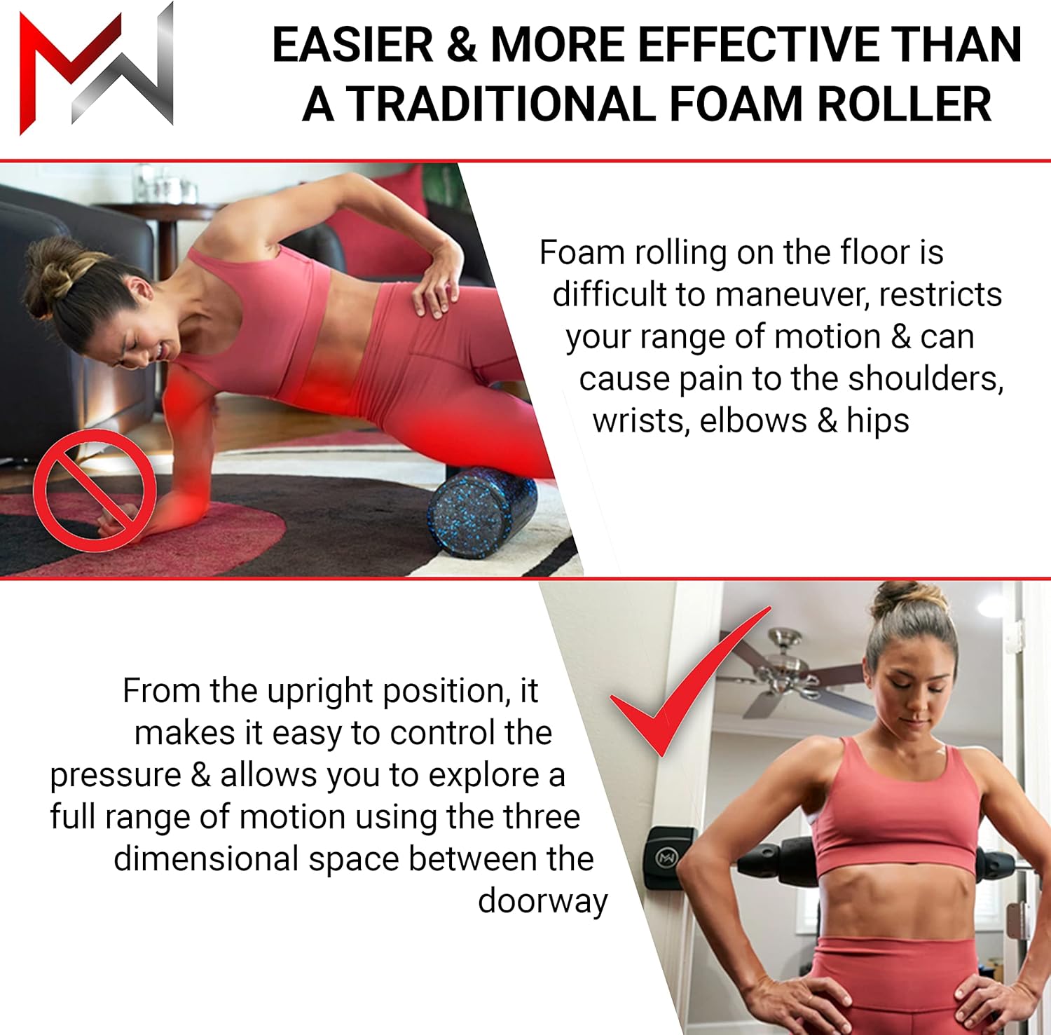 Upright Foam Rolling Conveniently designed for your homeLightweight and easy to adjust to any height in your doorwayYour door frame allows for increased angles and control of the pressure you apply to your soft tissue