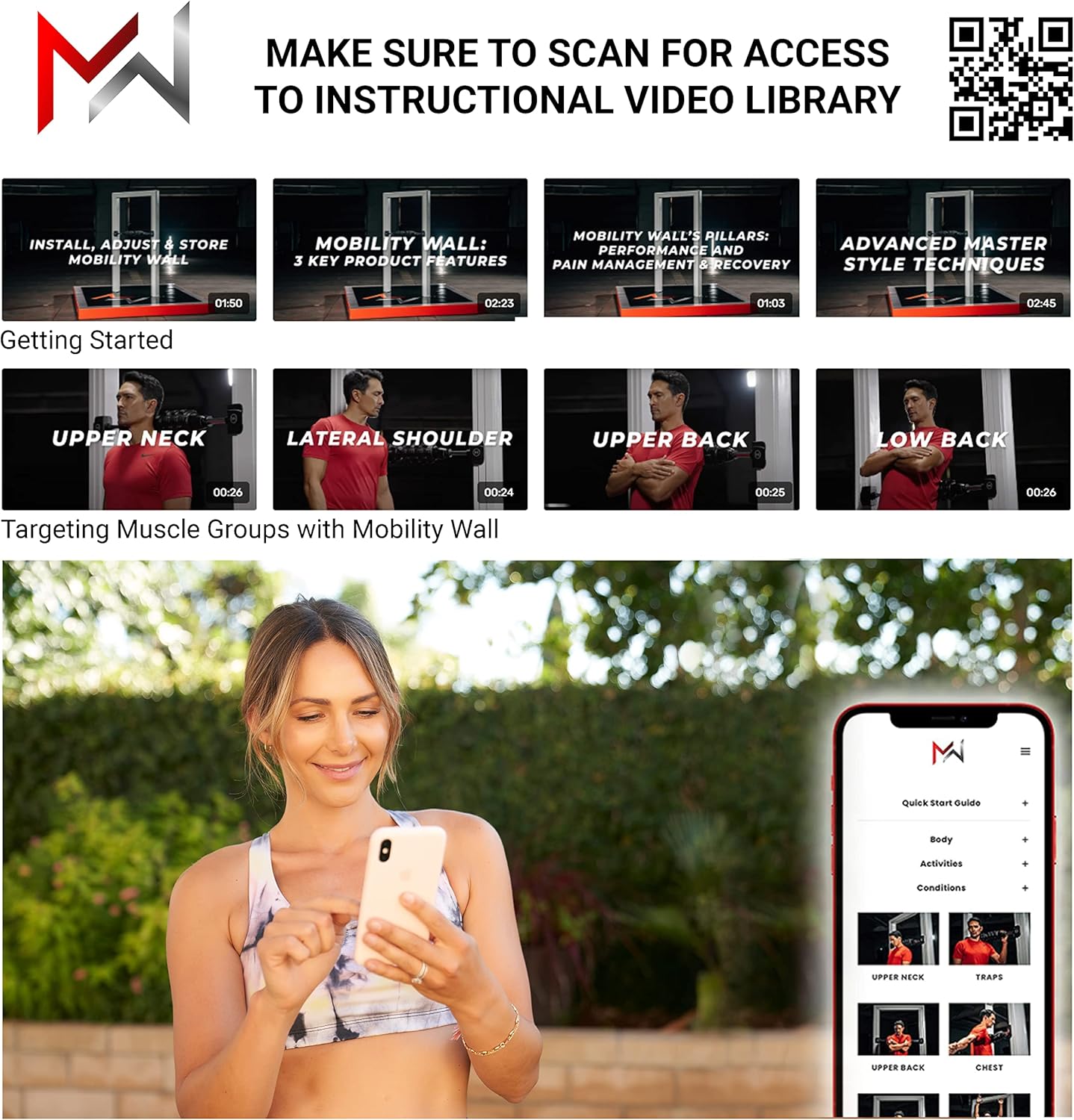 ALL ACCESS GUIDE – Download the FREE Instructional App! Includes a Quick Start Setup Guide with Instructional video or watch the Mobility Wall Quick Start videos on our website. Learn the best movements to help relieve pain and tension from tight muscles in many parts. Both pros & beginners can benefit from foam rolling.