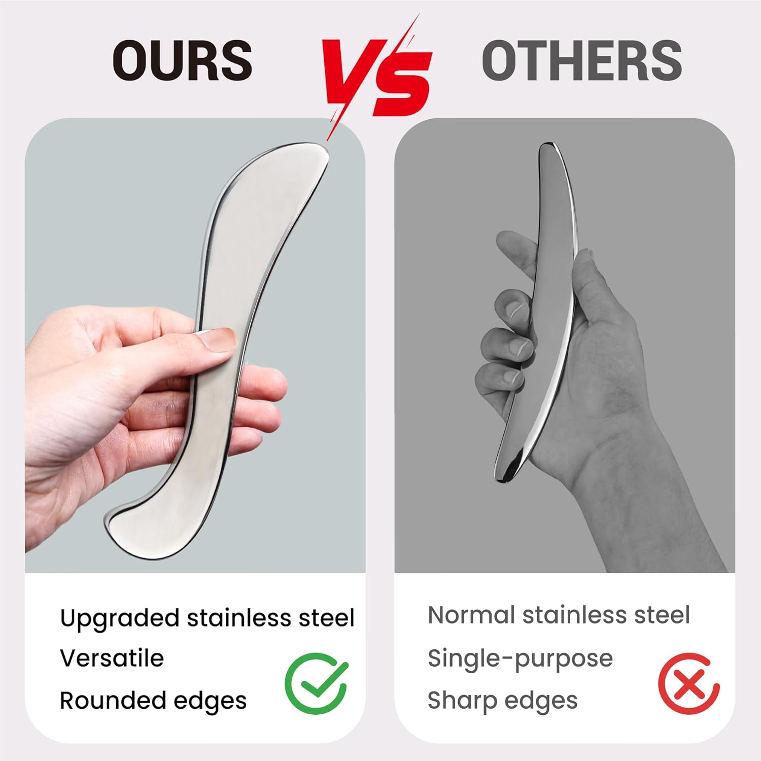 Premium Materials: Muscle scraping tool made of high quality stainless steel material, cold texture, edge upgrade and thickening, to ensure that it will not damage the skin during use