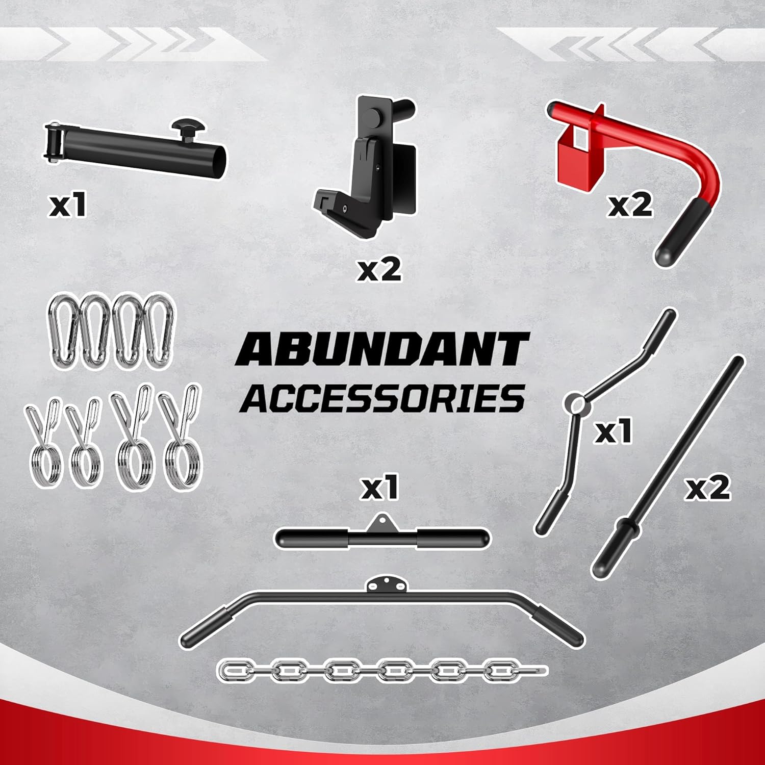 【Fully Equipped & Multi-Function】Equipped with a full set of professional fitness accessories, JELENS provides you with a complete and diverse home fitness experience. This includes:lat pull-down bar*1, cable bar*1, T-bar*1, pull down bar*1, J-hooks*2, safety rod*2, 360° landmine*1, counterweight racks with clamps*4. Meanwhile, all accessories can be quickly disassembled and installed, allowing you to switch sports modes more conveniently and quickly.