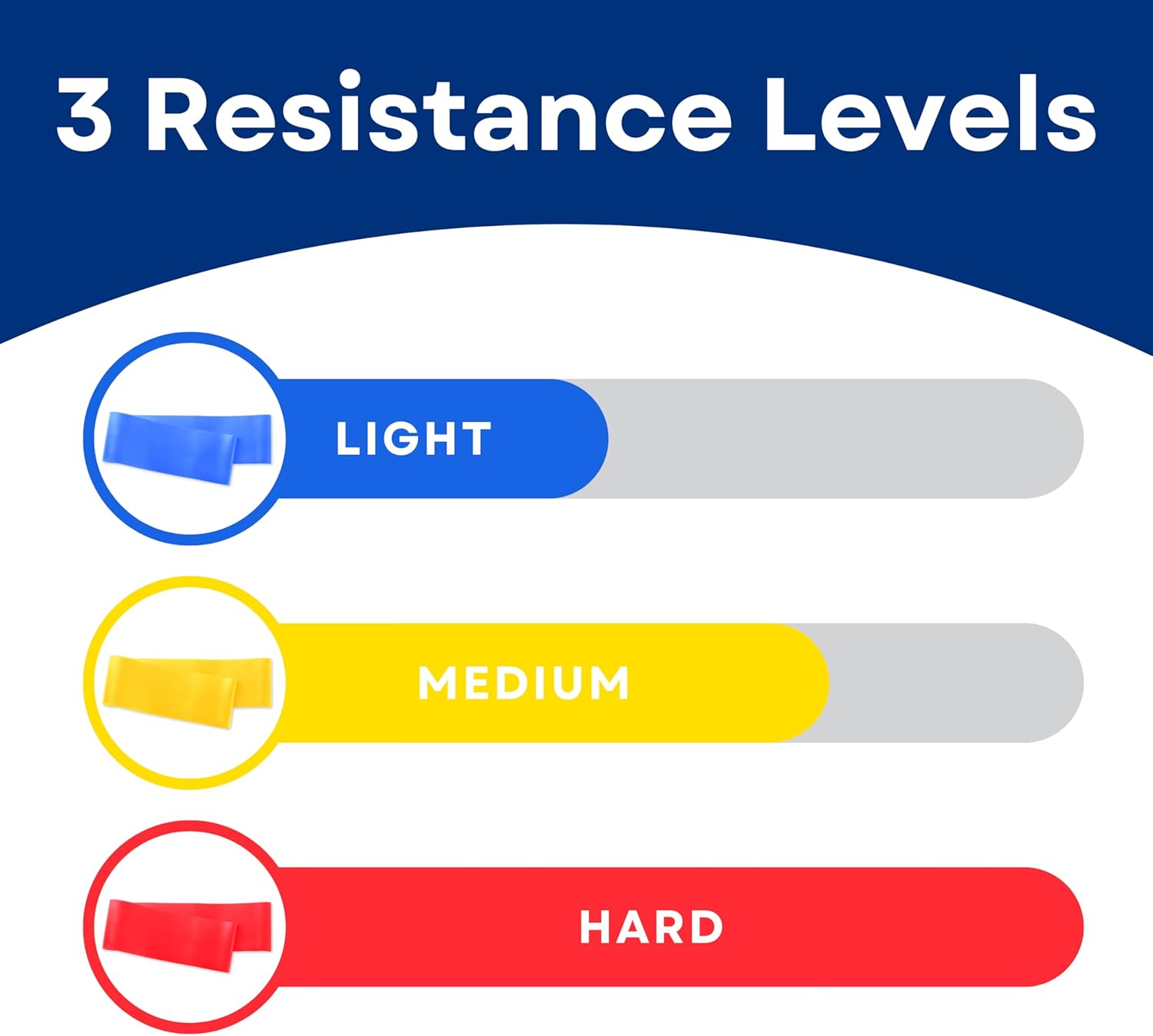 3 Resistance Levels for Custom Workouts: This set includes three resistance bands—light, medium, and heavy—allowing you to easily switch between levels for different exercises, from rehabilitation to advanced strength training. The bands measure 56 inches unstretched.