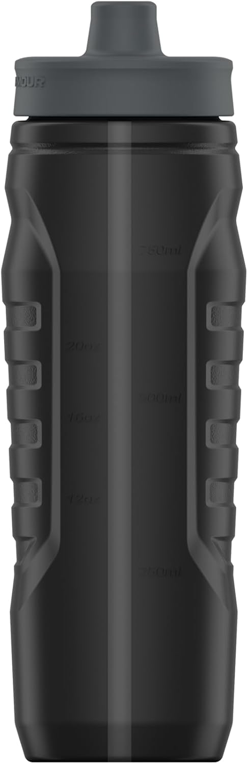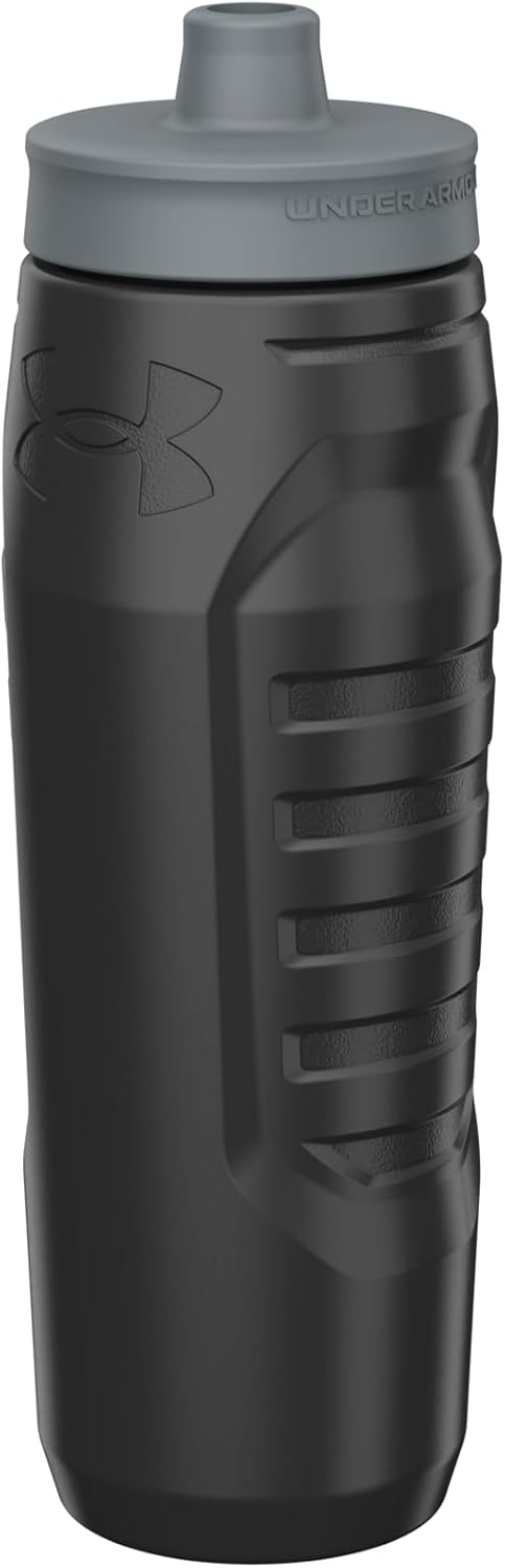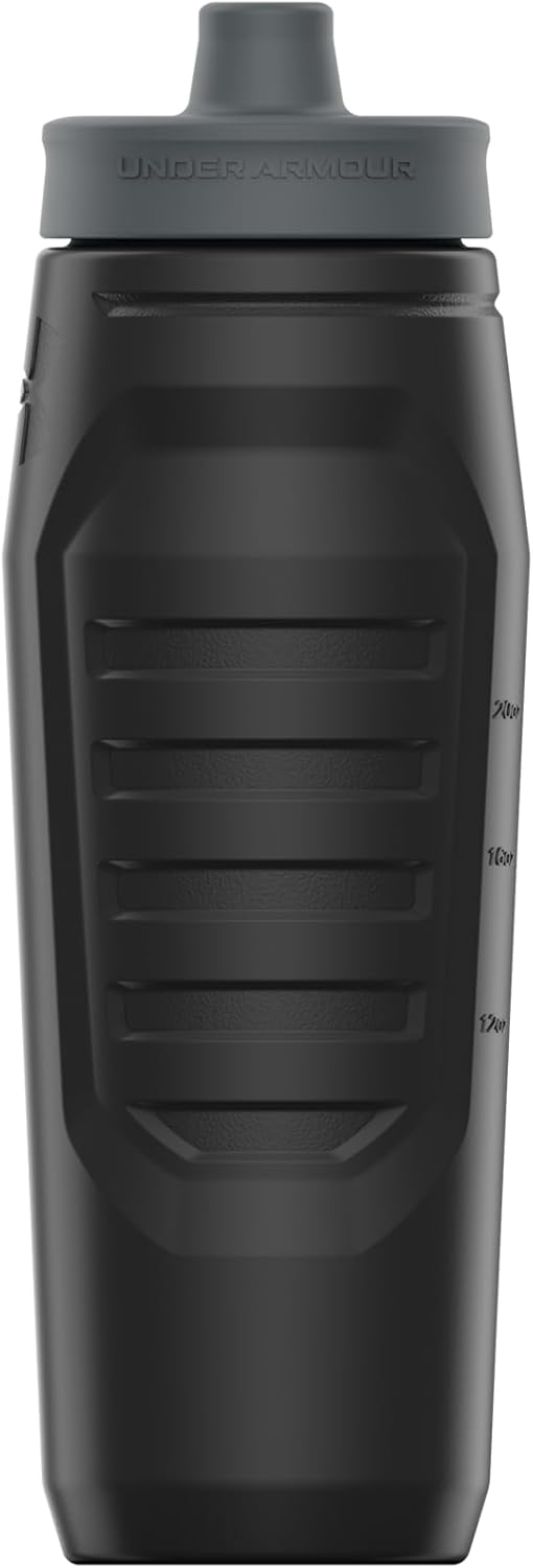 The Under Armour Sideline Squeeze Water Bottle is made for sports activities or everyday use. This sports squeeze water bottle holds 32 ounces, making it handy as a football water bottle, baseball water bottle, soccer water bottle, or hockey water bottle. Designed with a quick-shot lid and one-way valve, this squeeze water bottles sports solution helps you stay hydrated on-the-go. This football water bottle for boys and girls offers one-hand operation for those times when you need to hydrate without having both hands free. Its practical design includes marked measurements in ounces and milliliters, allowing you to track your water intake. The Under Armour Sideline Squeeze Water Bottle is also dishwasher safe (top rack only) and features a self-draining cap to prevent puddles. Crafted from BPA and lead-free materials. Whether you’re at the gym, on the field, or just out and about, this 32 oz squeeze bottle meets your hydration needs with ease. Stay refreshed during soccer practice, a baseball game, or a hockey match with this essential water bottle sports gear.