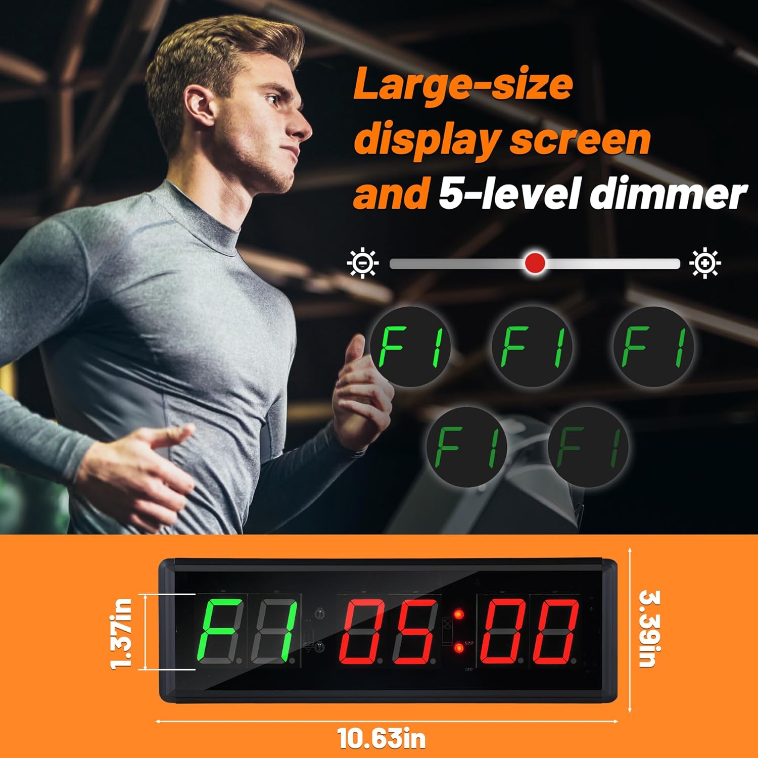 Gym Timer Clock For Home Gym: The fitness timer features a clear LED display with bright digital numbers, measuring 11 inches × 4 inches × 1.5 inches.12/24 Hours normal time, countdown/up in minutes and seconds, stopwatch, custom interval mode, Tabata,FGB1/FBG2,EMOM.
