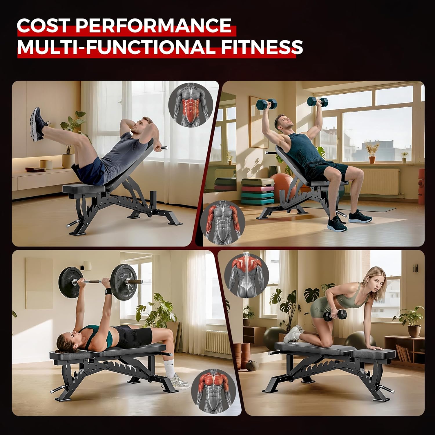 【QuickShift Adjustments】The weight benches for home gym provides 8 backrest adjustments and 4 seat position adjustments, targeting various muscle groups such as your chest, back, abdominal muscles, arms, and shoulders. Easily adjust to different angles in seconds with our pull-pin mechanism—unlocking versatile training positions.